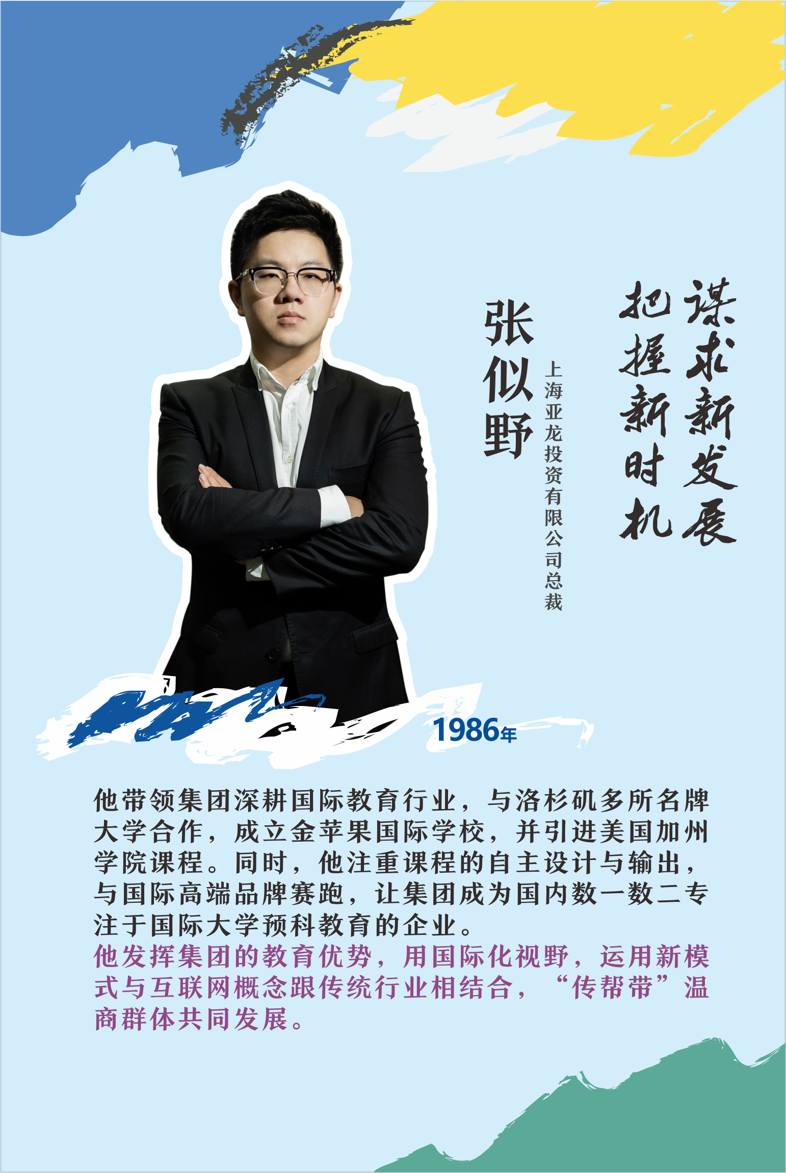 作为上海温州青年联会的副主席,张似野希望利用集团的教育优势,“传帮带”温商群体共同发展;作为“温二代”,他敬佩父辈吃得苦中苦、方为人上人,不畏艰辛、勇于创新的精神。他将接续传承父辈的创业精神,并加载国际化视野,运用好新模式与互联网概念,把握新时机,谋求新发展。