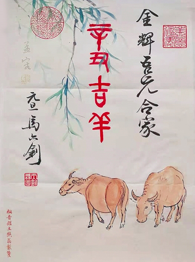 牛是人类的朋友,牛对人类贡献可大了。牛年,我们也应善待牛,以现代文明的态度保护牛等动物,世界和谐美好。和煦的阳光,陪伴着暖冬的日子。当在我撰写此稿时,收到马亦钊先生寄来的牛年贺卡。他每年都给我寄贺年卡,已经坚持十多年,不仅传递了他的问候,也记载了我们的情谊。今年的贺卡除了吉祥贺词外,还水印他爷爷、著名书画家马孟容的迎春图。双牛沐浴在春风杨柳下,春光一片。画面寓意吉祥,催人在牛年扬鞭奋蹄,志在千里。