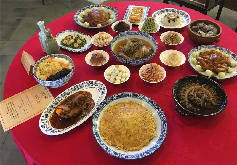 20世纪八九十年代的温州宴席菜肴,冷菜有挂霜羊尾、豌豆芽、荸荠白、海蜇丝,热菜有三鲜汤、咸菜全鸡(全鸭)、八宝饭、酒炖河鳗等