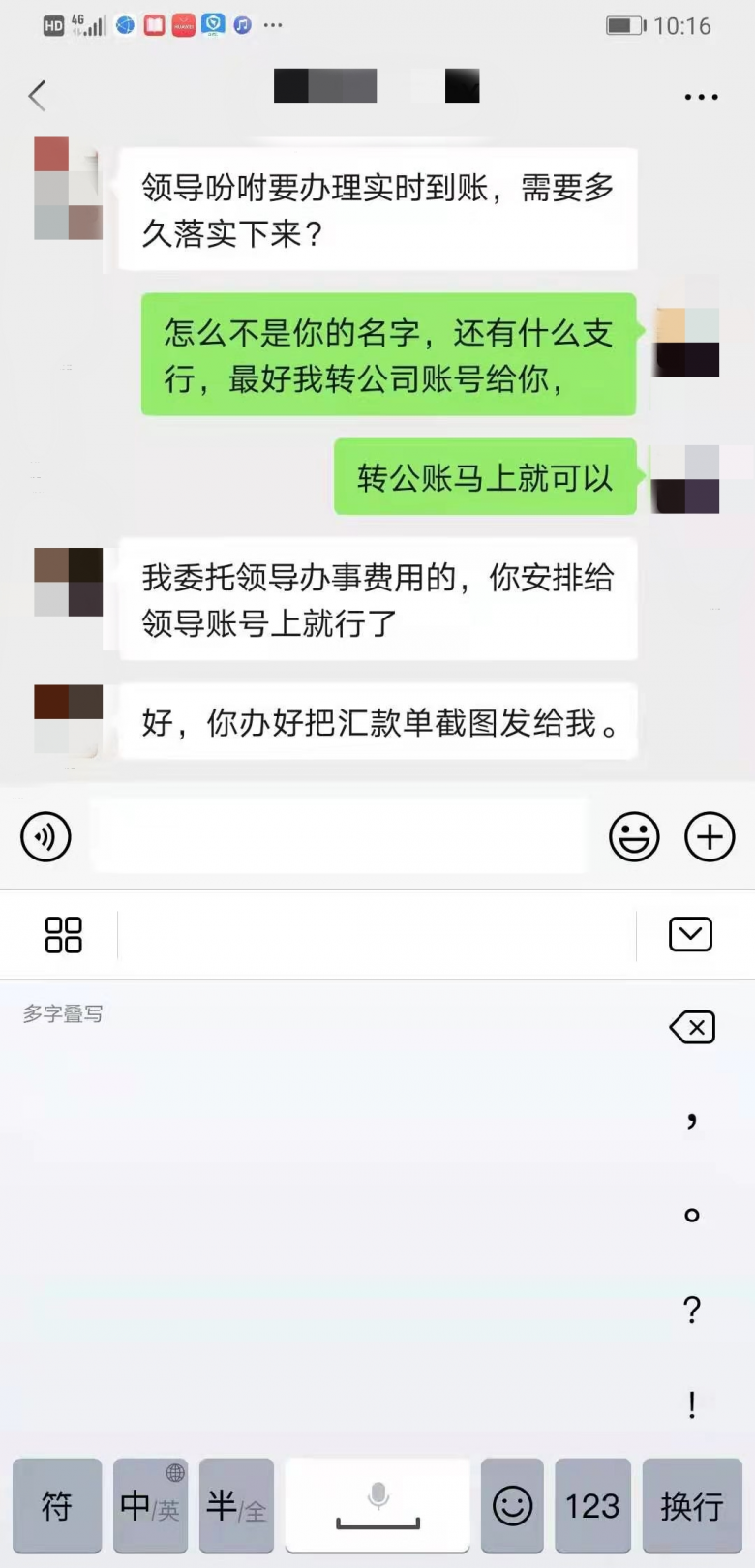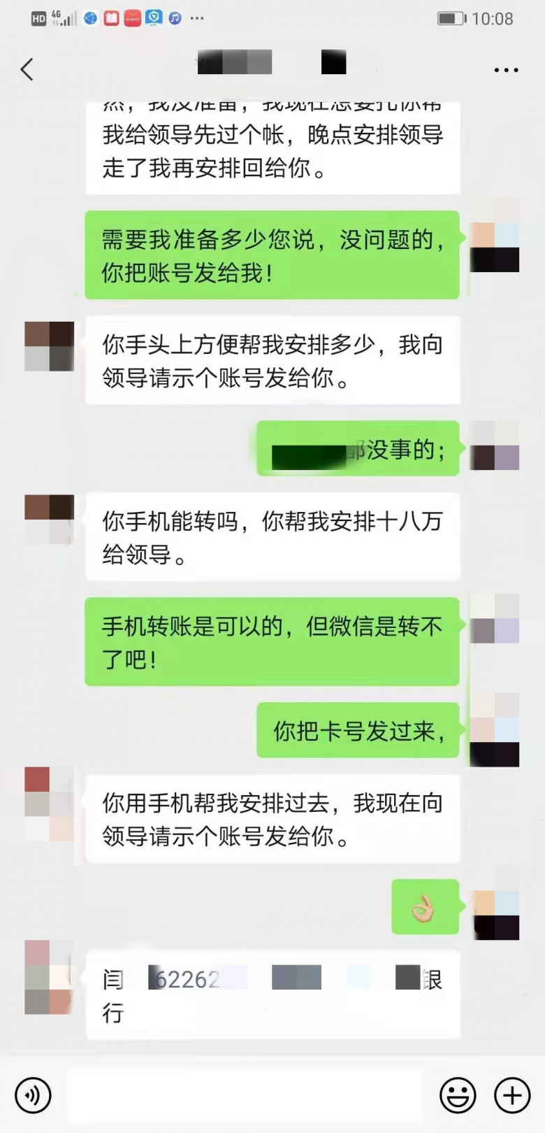 “需要我准备多少您说,没问题的,把账号发给我!”以为鱼儿已经上钩,骗子欣喜地发来了收款账户信息:“你手机能转吗,帮我安排18万元,闰某,某某银行。”“财务说这个是私人账户,我们需要对公账号才能转账。”杨某继续周旋道。