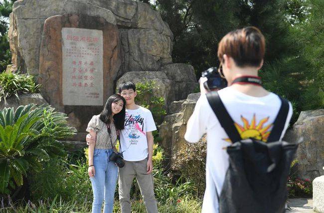 在半屏山的同源同根碑旁,许多台湾青年与之合影,他们表示,洞头和台湾高雄都有一座半屏山,在这里感到特别亲切。