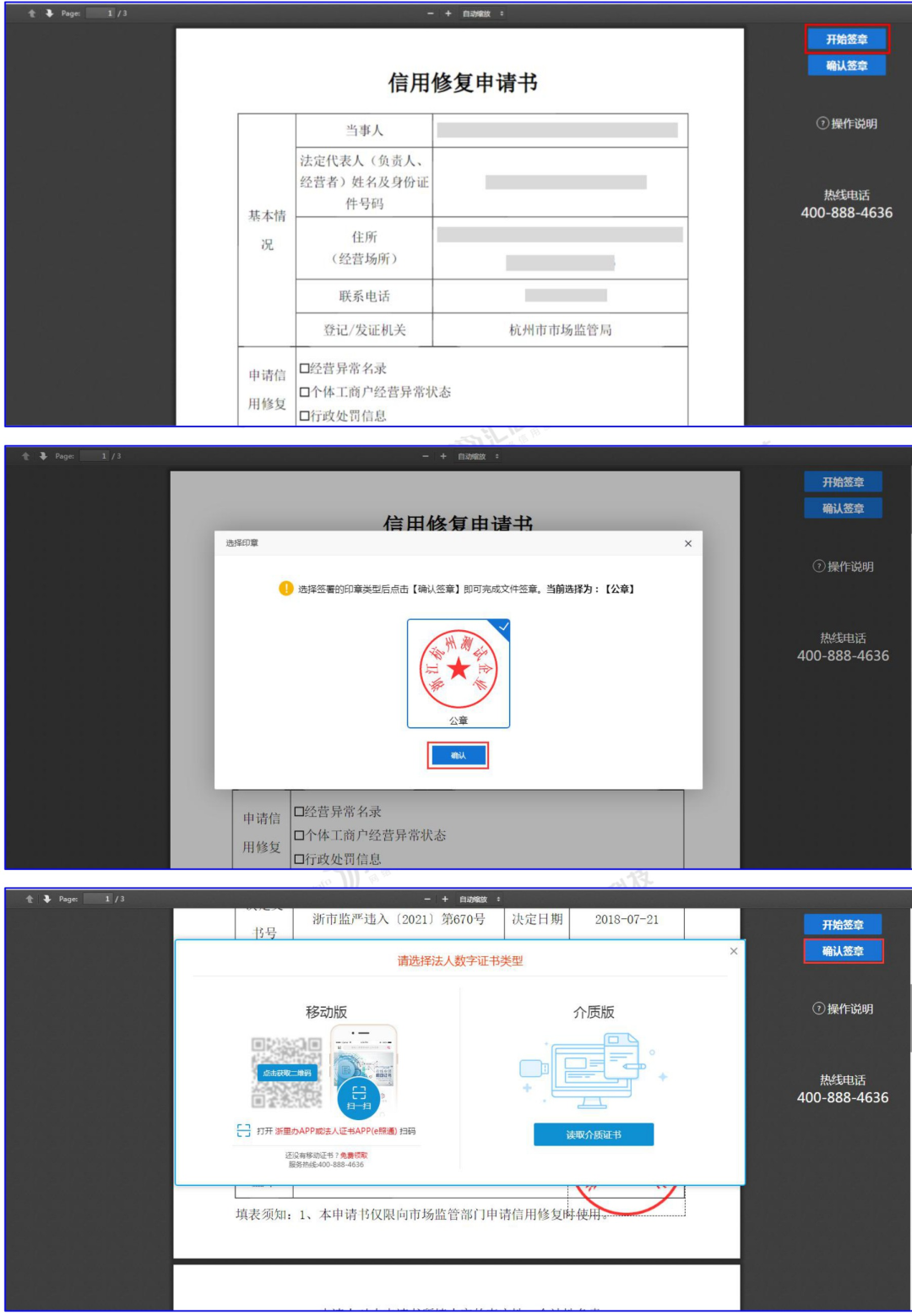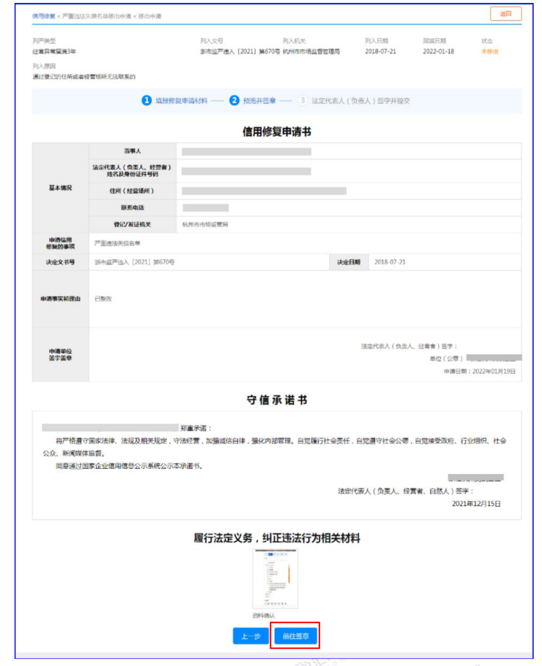 2、填写完成后,通过数字证书进行电子公章加盖和法定代表人(负责人)签字。