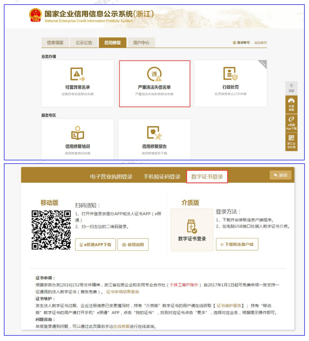 1、打开国家企业信用信息公示系统(浙江)(http://223.4.72.189/reg/client/login/all)-【信用修复】-【严重违法失信名单】,选择数字证书进行登录,如下图所示,进入填报页面,根据界面要求填写信息。