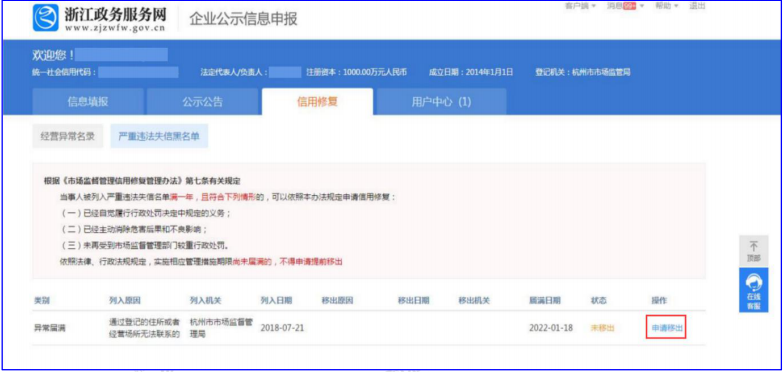 ❖移出经营异常名录