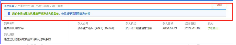 4、受理后,作出列严决定的部门应在 15 个工作日内作出是否予以修复的决定。状态显示为“予以移出”则严违名单移出成功,点击“详情”可下载查看“准予信用修复决定书”。