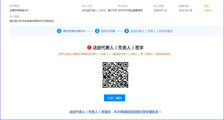 点击“关闭页面”,需法定代表人(负责人)“浙里办”扫码或经办人分享二维码给法定代表人完成签字。