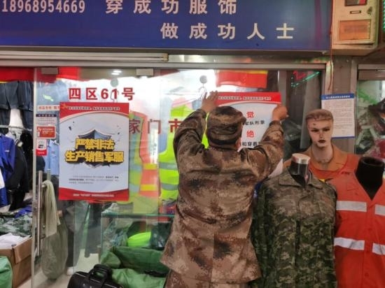 行动主要围绕净化网络环境、整治市场秩序、纠治穿着使用、清查管理漏洞等4项重点任务展开,时间为期一年。执法中,检查组对存在问题的店铺指出了整改措施和完成时限,对店主进行了耐心细致的教育引导,切实维护军服的严肃性。