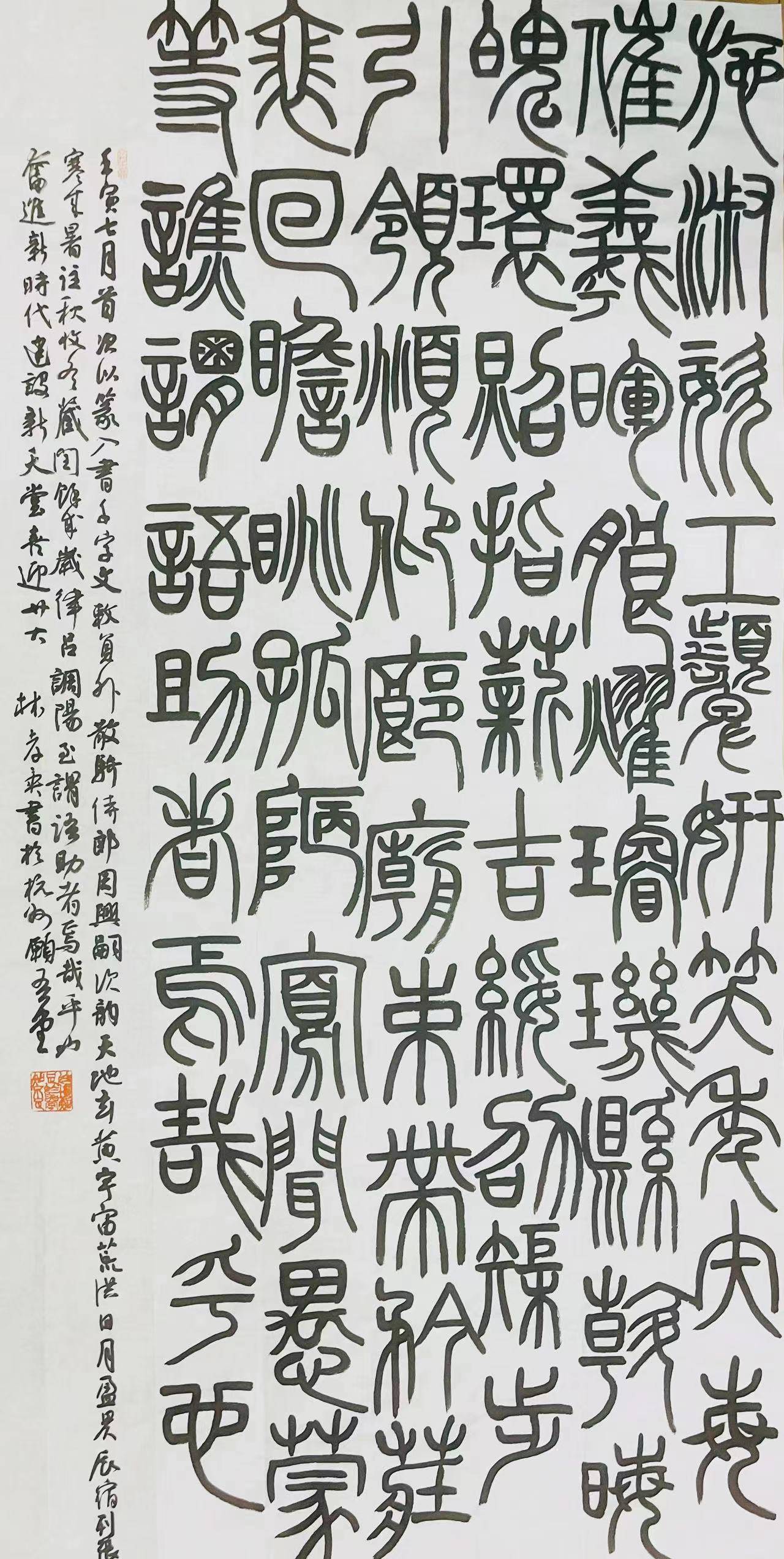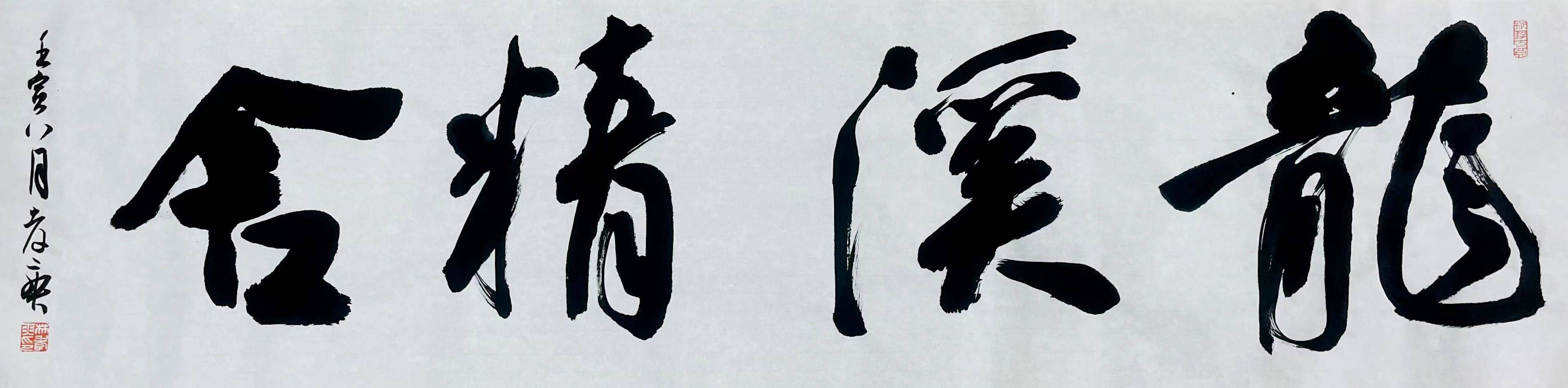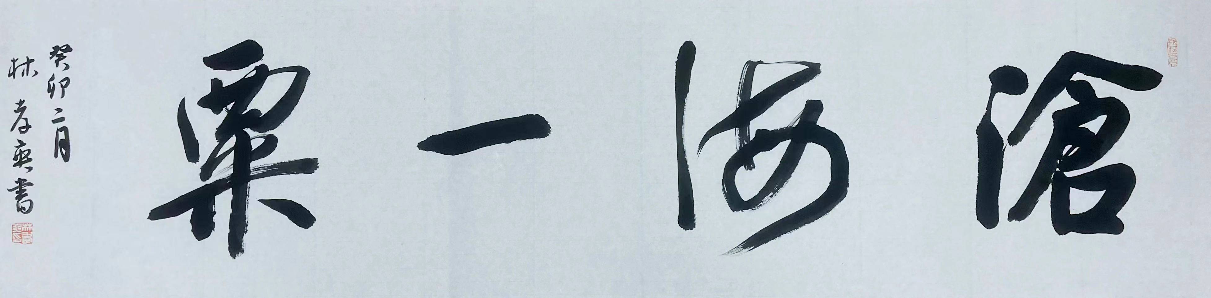 他与我同乡,对习书的感悟与体会,有许多的共同点,所以,读他的书作很是亲切。他善于吸收前贤和今人的优点,融入他自己独特的书写体势,洒脱奔放,姿态百出,奇趣万千。他的字里行间所表达的笔意,既行既草,流丽畅达,一望便知是他的字,且他创作的作品尺幅大,字数足,情感饱满,真力弥漫,这在同侪中也是罕见的。就此而言,他是成功的实践者。