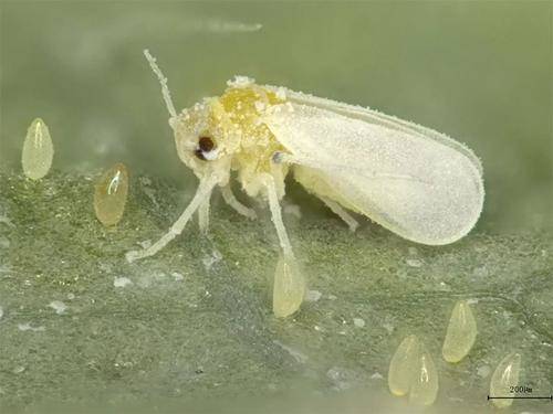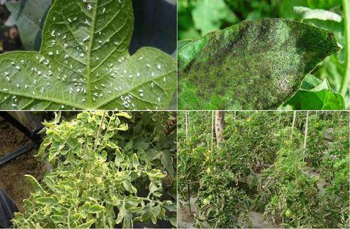 粉虱类害虫是茄果类上的主要害虫,主要为害番茄、茄子、花菜、球菜、豇豆、瓜类等蔬菜作物。粉虱类以刺吸式方式吸取植物汁液,导致叶片褪绿变黄、萎蔫,最后全株枯死。特别是对番茄幼苗为害后,还能传播番茄黄化曲叶病毒病,造成番茄严重发病而减产,甚至绝收。田间症状以花叶、蕨叶、条斑三种最为常见。防止大田番茄黄化曲叶病毒病的发生,最有效的措施须在育苗和移栽期间,做好对烟粉虱的防治工作。