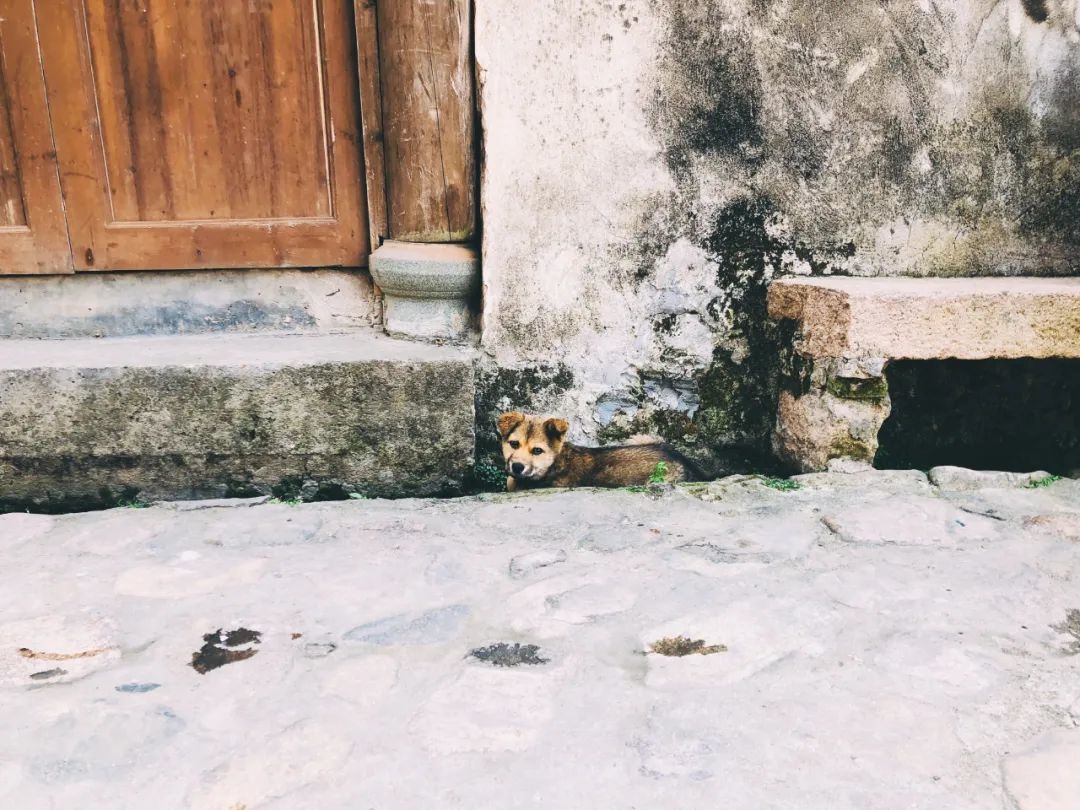 老房子的门前,懒洋洋的小奶狗还是一副未睡醒的呆萌模样,匿身于小沟渠里,安逸自在。