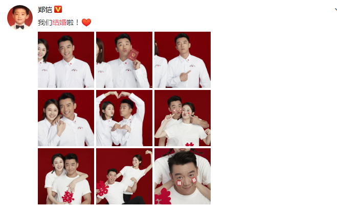 5月21日13点14分,郑恺、苗苗晒出结婚照官宣结婚喜讯,“我们结婚啦!”照片中,苗苗从背后抚摸郑恺的肚子,画风搞怪。恭喜恭喜!