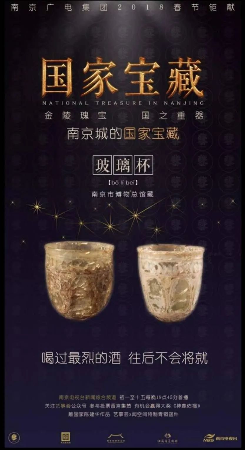 南京博物馆总馆有一幅《国家宝藏》海报,内容是“金陵瑰宝,国之重器”,“南京城的国家宝藏----玻璃杯”,画面就是两只出土于王廙墓的罗马玻璃杯。南京电视台还拍了一个国宝在金陵的专题片,“残破的玻璃----东晋罗马玻璃杯”,主角也是王廙的磨花玻璃杯,由此可见东晋玻璃杯之文物学地位。