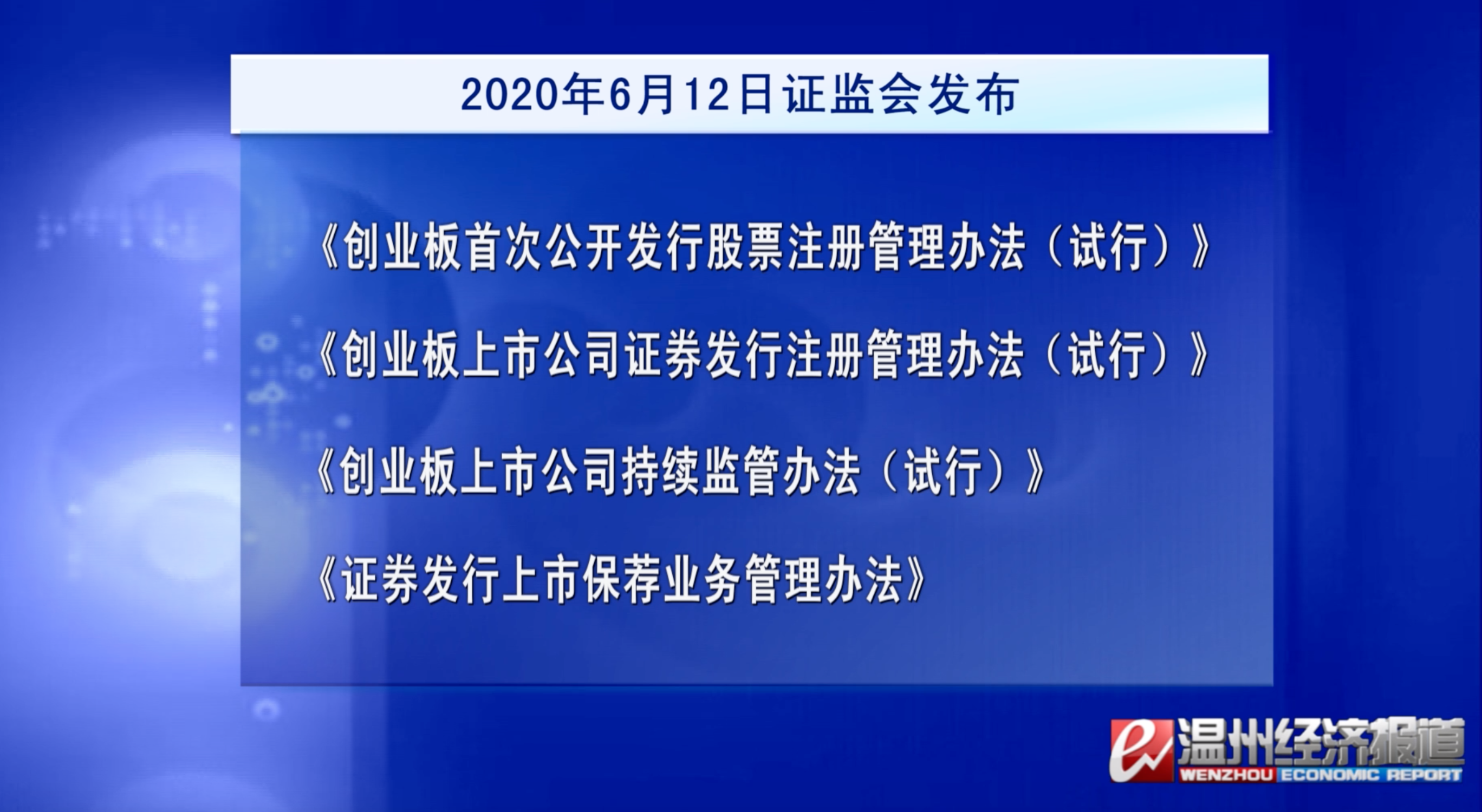2020年6月12日,证监会发布了《创业板首次公开发行股票注册管理办法(试行)》、《创业板上市公司证券发行注册管理办法(试行)》《创业板上市公司持续监管办法(试行)》和《证券发行上市保荐业务管理办法》,自公布之日起施行。与此同时,证监会、深交所、中国结算、证券业协会等发布了相关配套规则。除上述已开始实施的投资者适当性管理部分,其他改革措施尚在征求意见,有待后续正式文件颁布。其中变化主要有以下3个重点:交易规则方面:新股上市前5个交易日不设涨跌幅限制,此后单日涨跌幅限制20%;发行方面:优化审核注册程序,压缩审核注册期限;第三,完善退市机制,简化退市程序,取消暂停上市和恢复上市(环节)、新增市值退市指标等。