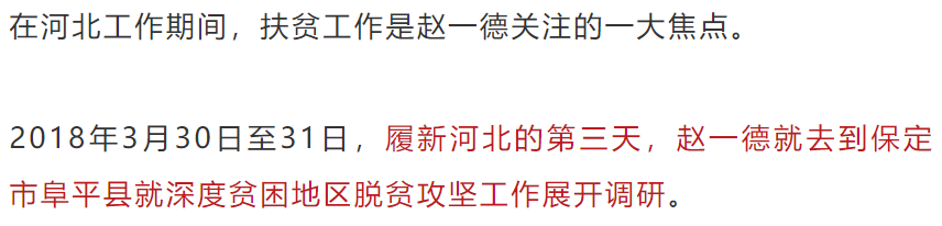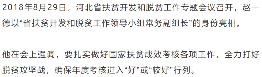 2018年4月4日至6日,就打好脱贫攻坚战到承德市调研。 4月12日至14日,就推进精准扶贫精准脱贫到衡水市调研。 4月21日,河北省扶贫开发和脱贫工作领导小组召开全体会议,赵一德参加会议并通报考核情况。 4月27日,就打好脱贫攻坚战又来到邢台市调研。