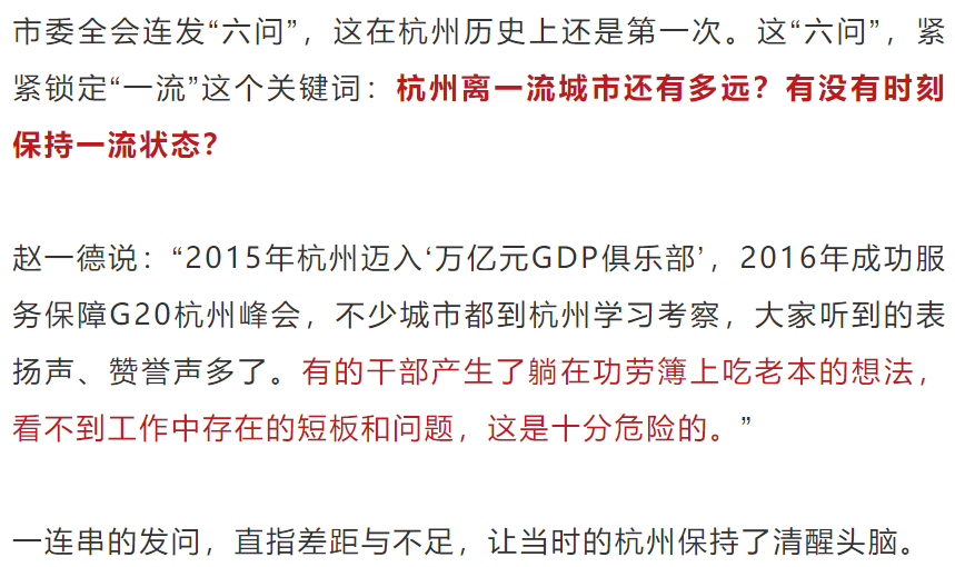 一问奋勇争先的进取意识有没有达到一流? 二问统筹谋划的理念思路有没有达到一流? 三问敢闯敢试的改革劲头有没有达到一流? 四问担当负责的实干精神有没有达到一流? 五问引领未来发展的创新能力有没有达到一流? 六问城市治理的能力有没有达到一流?
