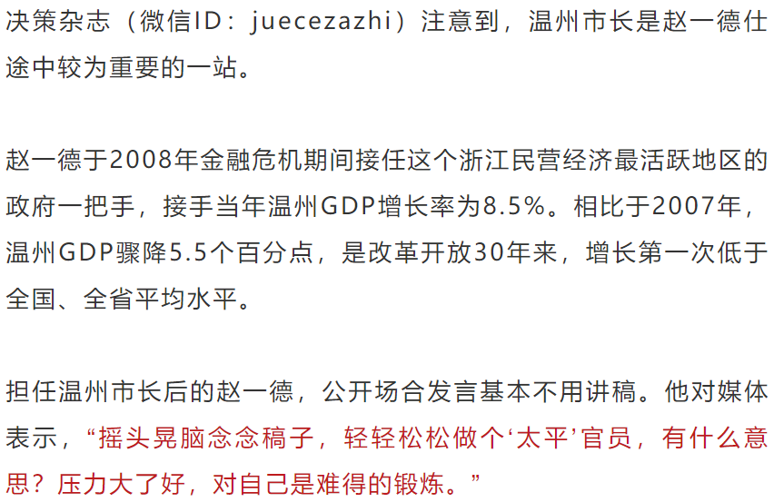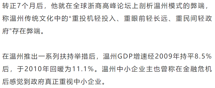 几天之后,在对这次活动做阶段性小结时,时任温州市长赵一德直指温州存在四个“滞后”:一是相对于工业化发展,城市化滞后;二是相对于制造业发展,现代服务业滞后;三是相对于经济指标的增长,以民生为重点的社会建设滞后;四是相对于市场经济主体的活力,发展环境和公共服务滞后。