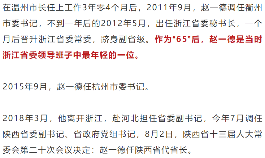 8月25日,陕西省第十三届人民代表大会第四次会议选举赵一德为陕西省省长。值得注意的是,此番当选,赵一德成为现任全国最年轻省长。