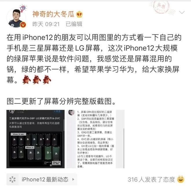 根据网友们的说法,本次iPhone 12“绿屏”问题涉及到的机型为iPhone 12 mini、iPhone 12、iPhone 12 Pro和iPhone 12 Pro Max。