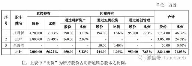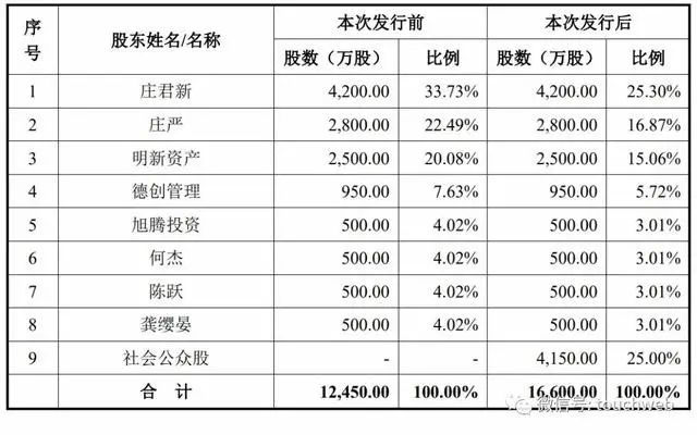 IPO后,庄君新持股为25.3%,庄严持股16.87%,明新资产持股为15.06%;德创管理持股为5.72%;旭腾投资、何杰、陈跃、龚缨晏分别持股为3.01%。