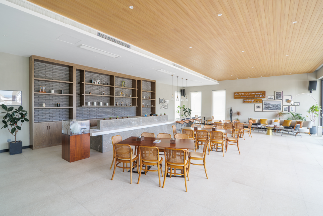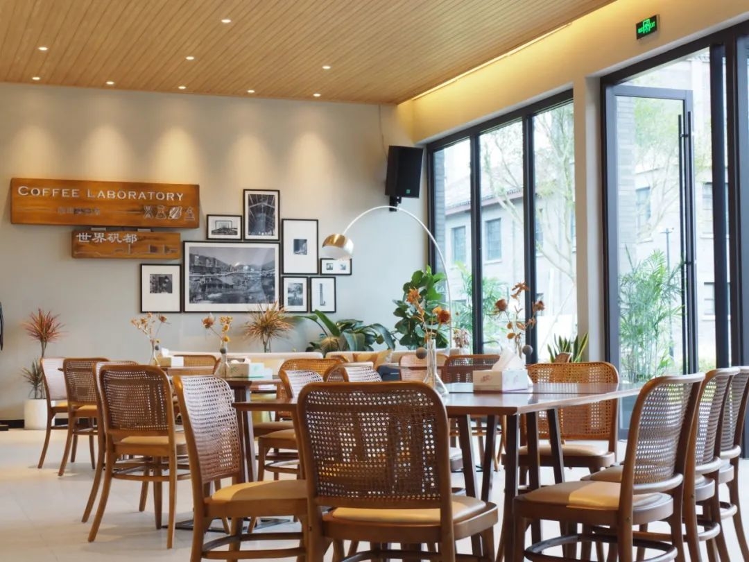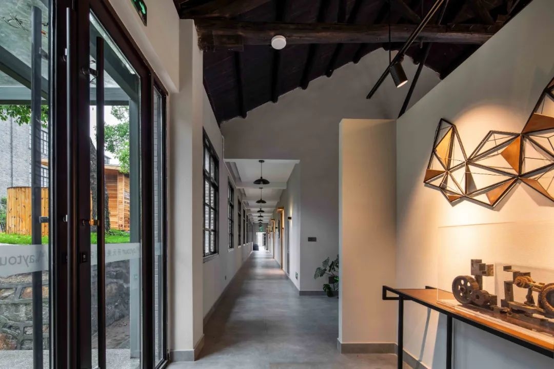走进酒店内部,挑高的顶层、木质屋顶桁架、轻奢风吊灯、复古工业齿轮……现代与历史交织在这个空间内,碰撞出了独特雅致的感觉。