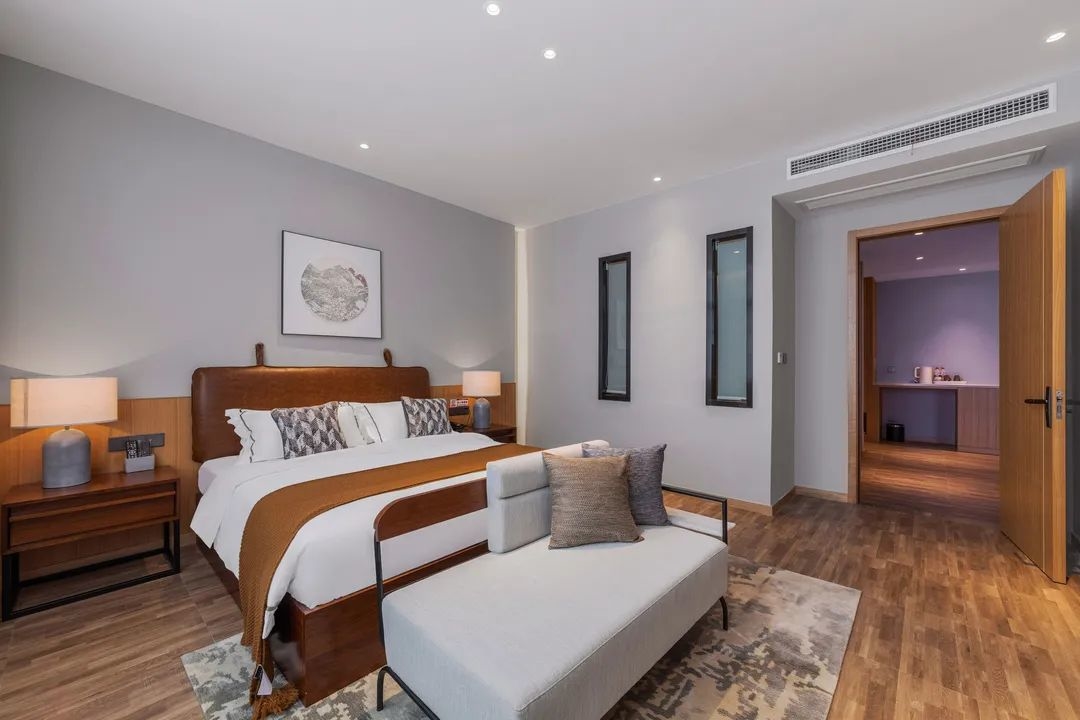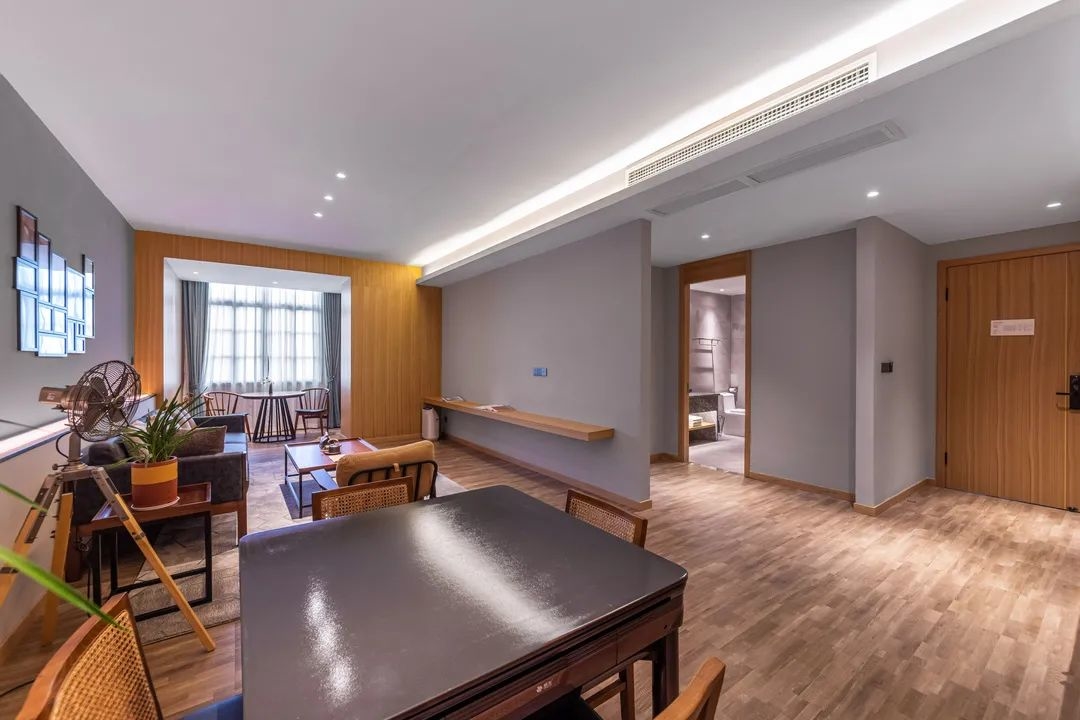 酒店房间内,低调简约的工业风软装,干净整洁的住宿环境,柔软的织物和温润的木质家具,营造出了舒适温馨、如家般的居住氛围,让每一位客人都有宾至如归的体验。