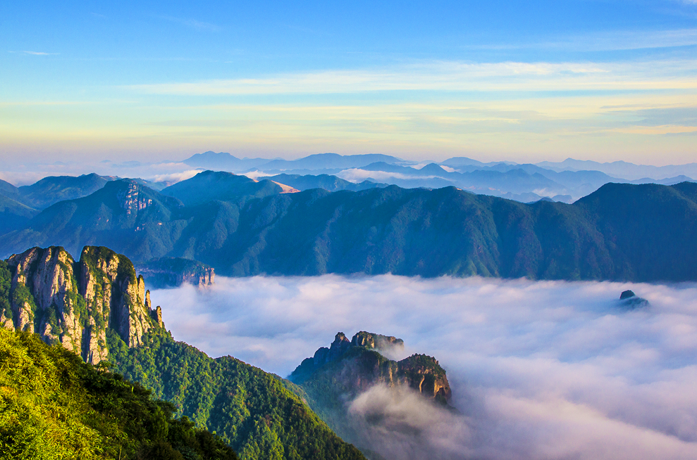 玉甑峰是中雁荡山的图腾,中雁的一切峰谷云水都由它来结构,白石湖、钟前湖、龙山湖,如三颗明珠嵌在山腹,高耸入云天的玉甑峰,能让你产生“路从飞鸟头上过,人在白云深处行”的感觉。