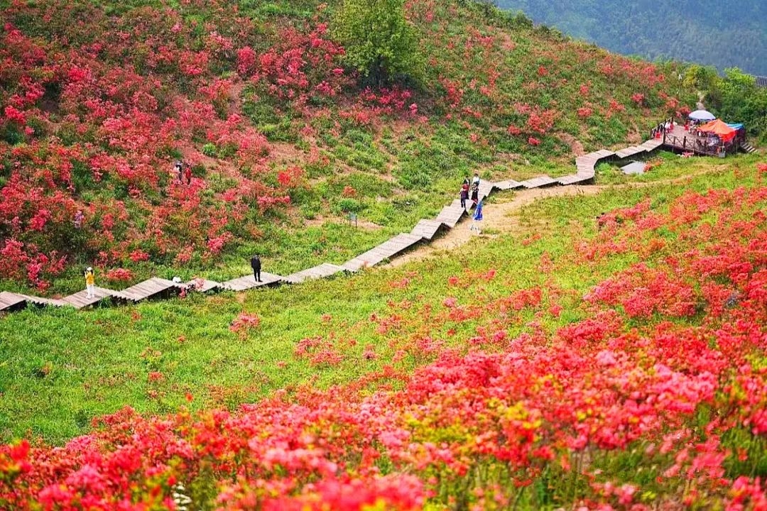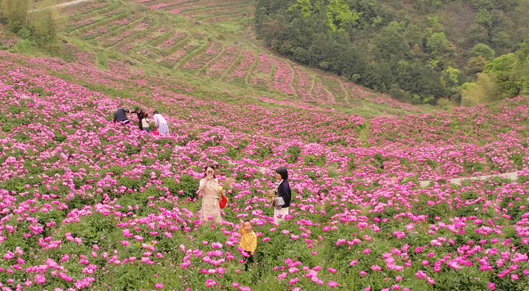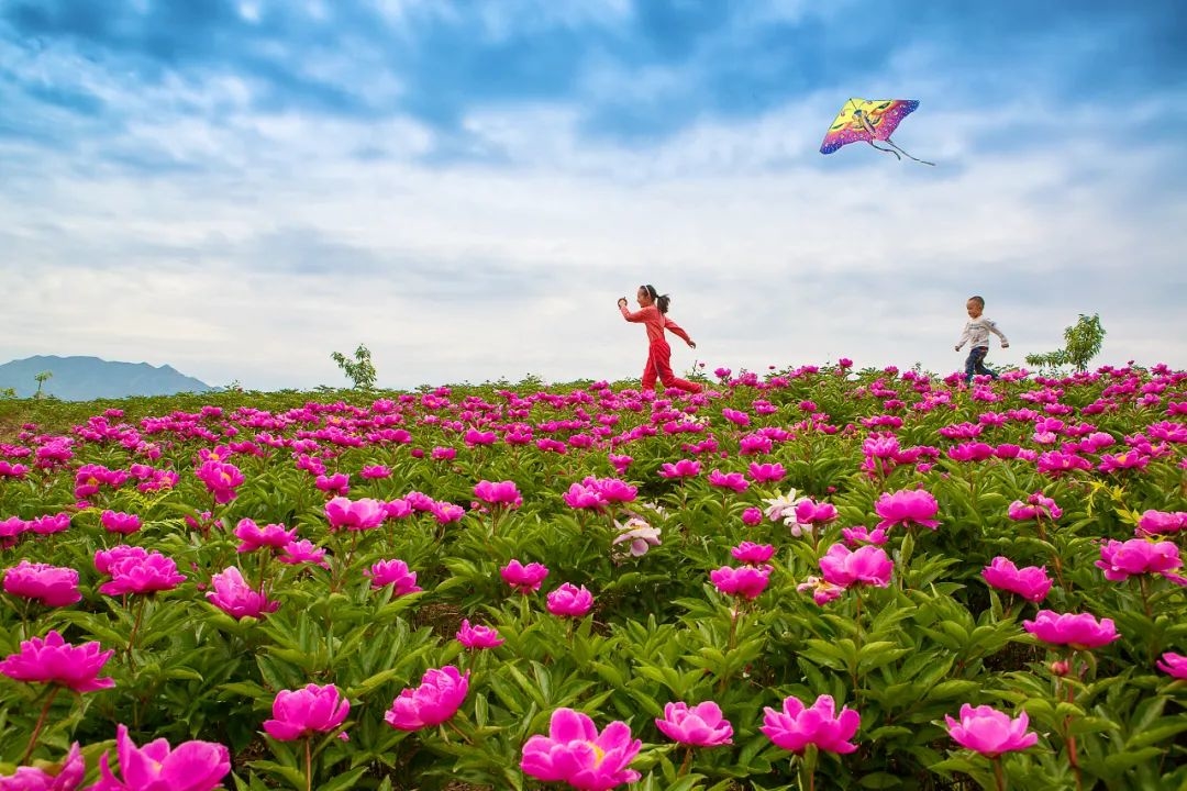 开在春季末端的芍药花,更让人有着惜春之感。芙蓉镇前垟村鸟门山上,220亩、60万株芍药红绡绽放,如锦似霞地镶嵌在绿叶之中,汇成一片花海在春末暖阳下灼灼灿然。在芍药花海里走一走,空气中弥漫着淡淡木质清香,沁入肺腑。