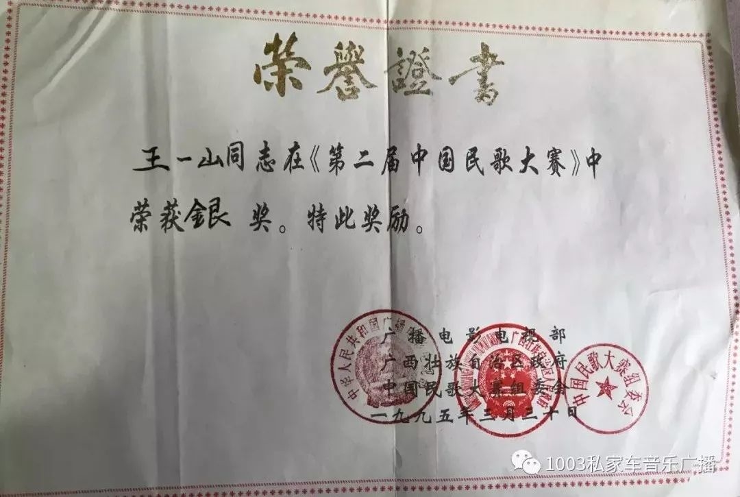 王一山获奖证书