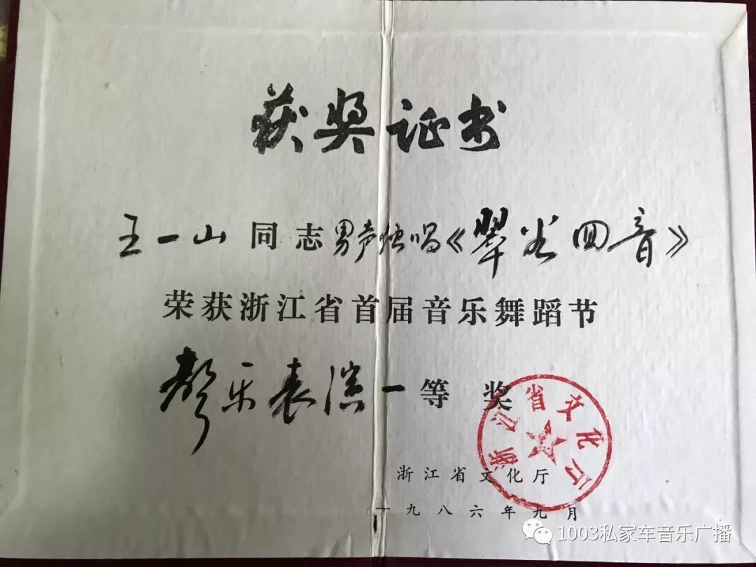 受到鼓舞的王一山去群艺馆跟胡成辉和余小玲学声乐,那时候正逢四人帮粉碎之后,温州的职工文化非常活跃,各个单位都有宣传队。温州印刷机械总厂的领导非常重视职工的文艺文化,便招聘了一批温州的文艺积极分子,王一山就是其中一员。印刷机械厂给了王一山一方新天地,他开始活跃在温州的文艺舞台,经常参加各种活动。他谦虚、勤奋、好学,深受同伴们的喜爱。当时有一个沙龙,都是温州的声乐爱好者,为了得到跟多的锻炼机会,王一山经常给手风琴乐手陈强背琴,琴背多了,两人的关系自然也就好了,常常一起合作。那时候王一山在温州已经小有名气了,1982年杭宁温三地职工代表歌唱比赛,王一山代表温州参加,凭借着一首《乌苏里船歌》一举夺得了一等奖。比赛后胡成辉老师向浙江省歌舞团推荐了他,就这样,王一山被借用到浙歌。临走时,母亲眼泪汪汪舍不得他远行,王一山狠狠心拎起箱子大步往前走,他不敢回头。这个镜头王一山至今忘不了,每每想起,心中无限内疚。